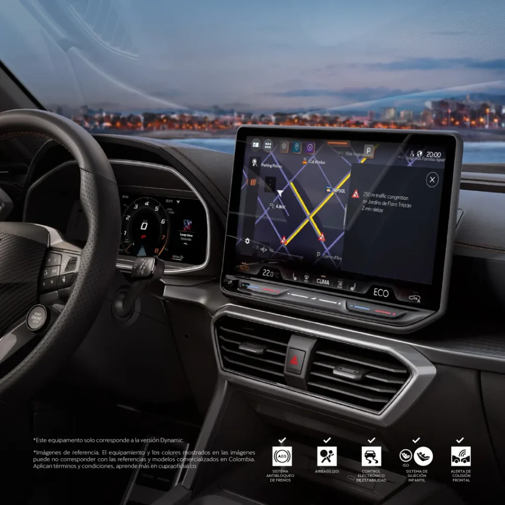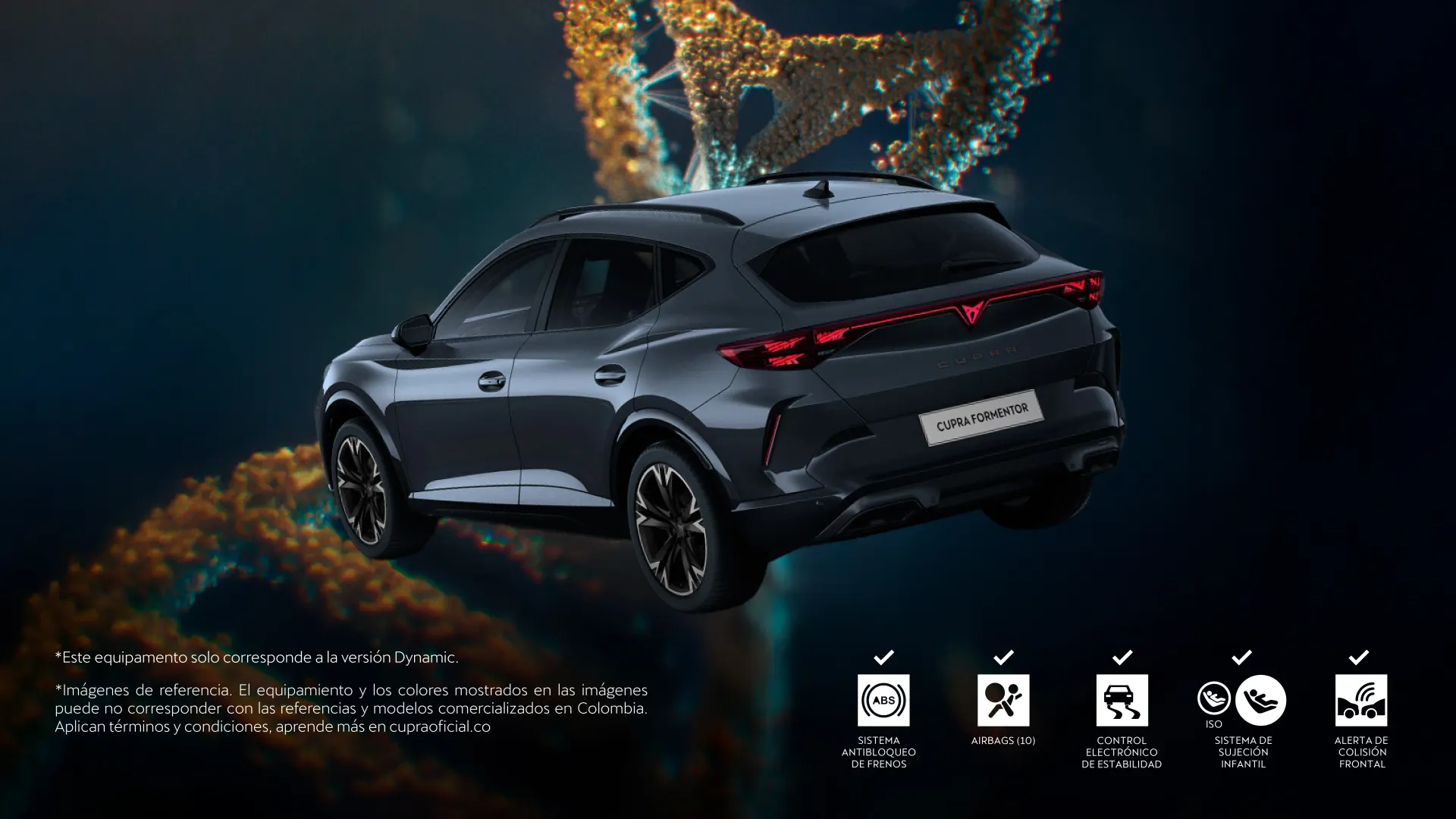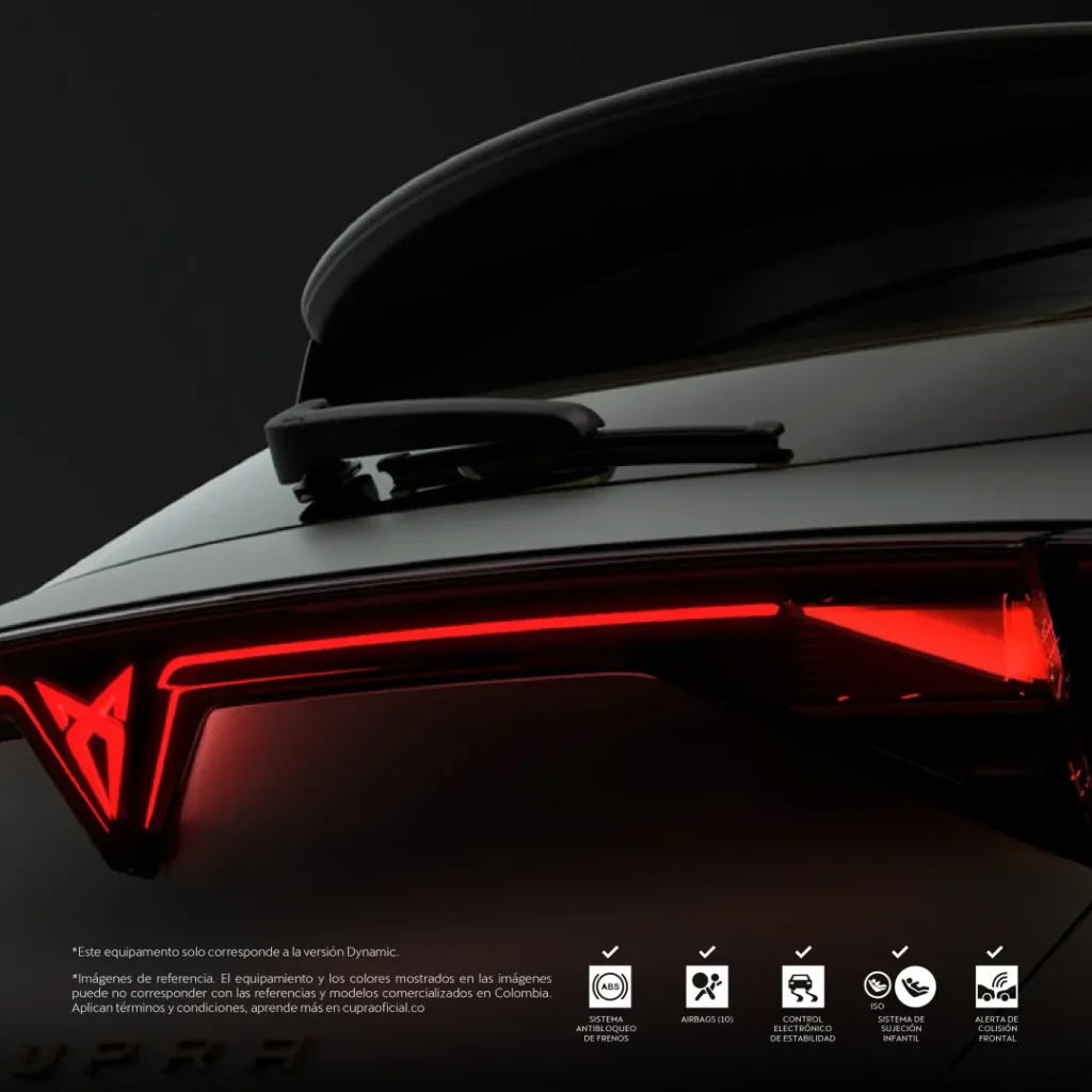 *Imágenes de referencia. Los equipamientos, accesorios y/o colores hacen parte de la ambientación fotográfica o pueden no corresponder con las referencias y modelos comercializados en Colombia o no constituir una referencia exacta del vehículo ofrecido en la red autorizada de concesionarios. Consultar ficha técnica disponible en CUPRA Colombia | Conoce nuestro CUPRA FORMENTOR . Oferta válida financiando únicamente con los aliados de Porsche Movilidad Colombia S.A.S. (en adelante “Porsche Movilidad”). Aplica directamente en la red autorizada de concesionarios CUPRA a nivel nacional.